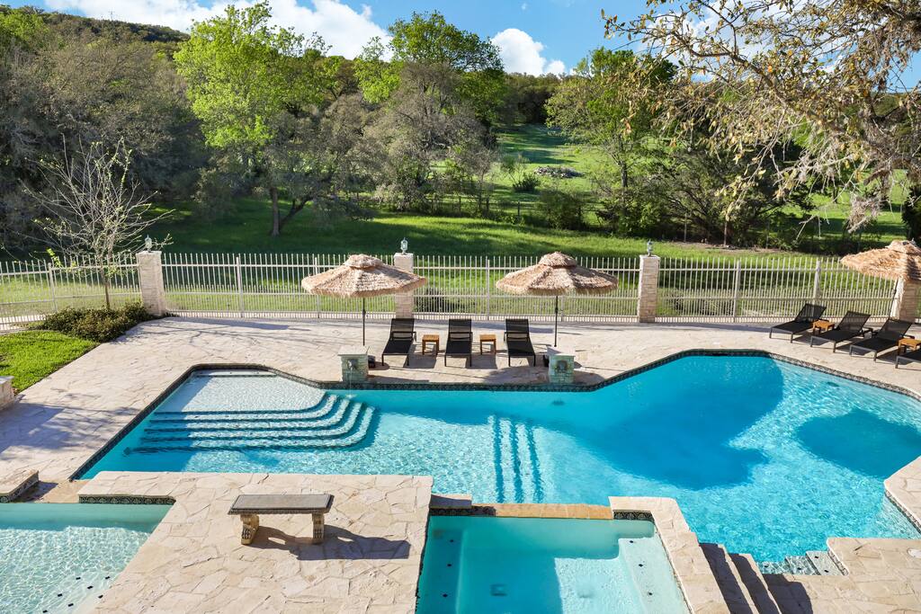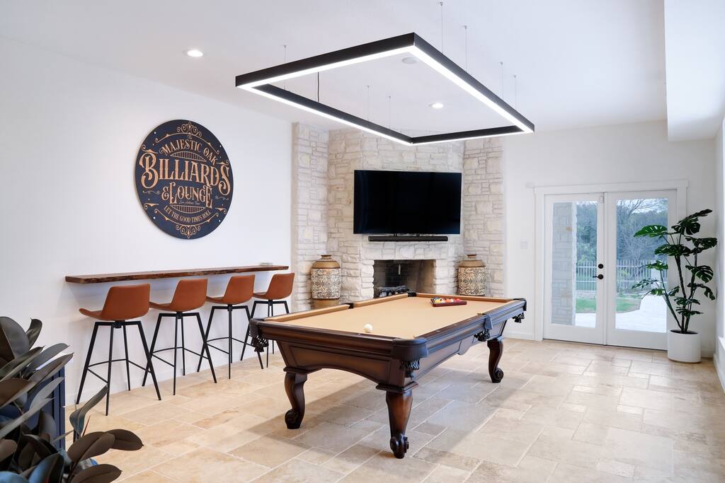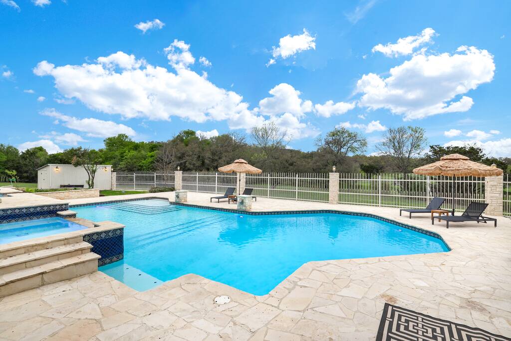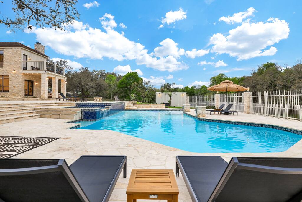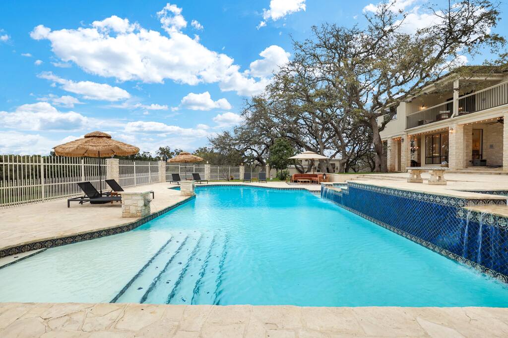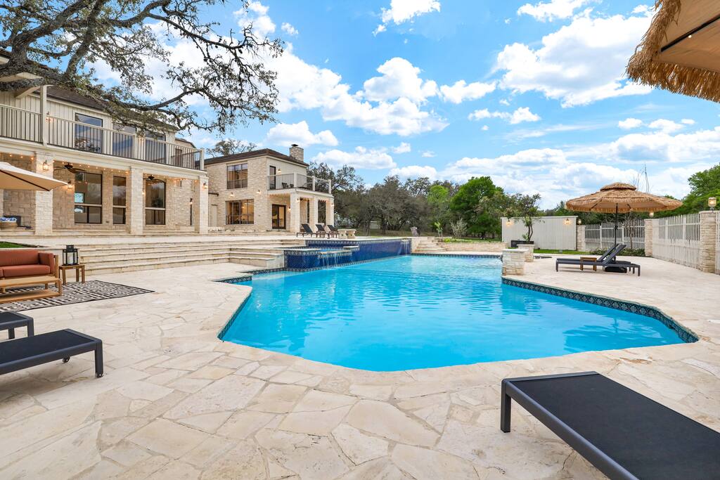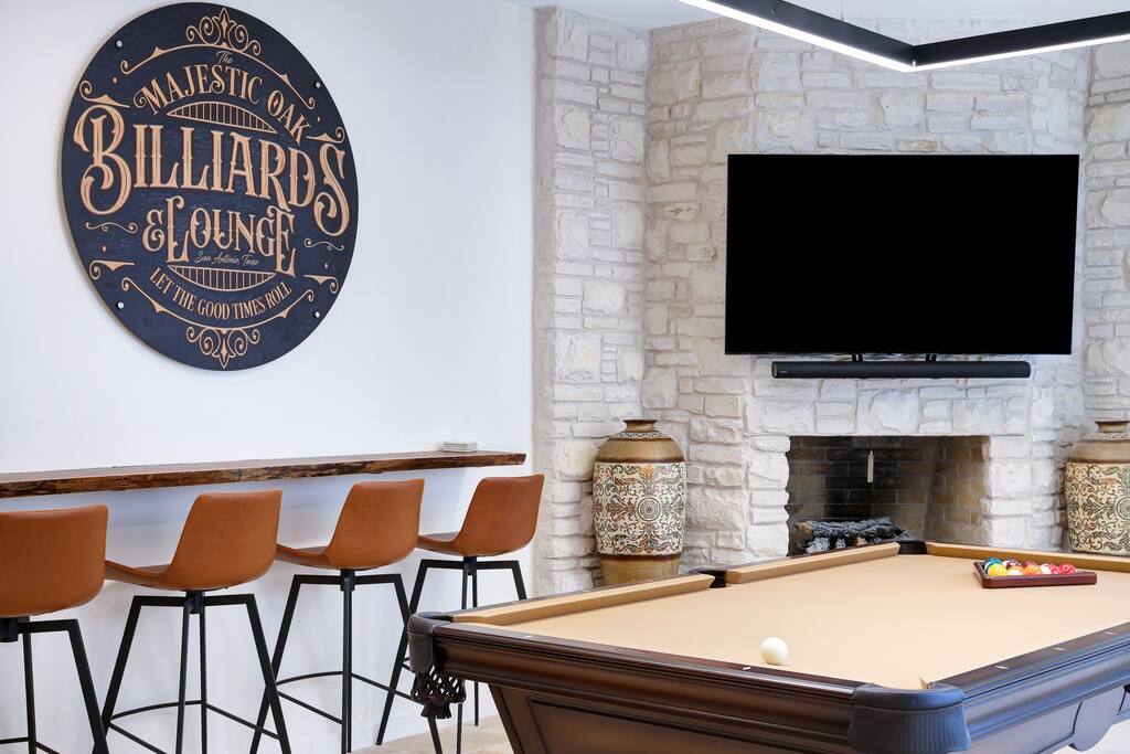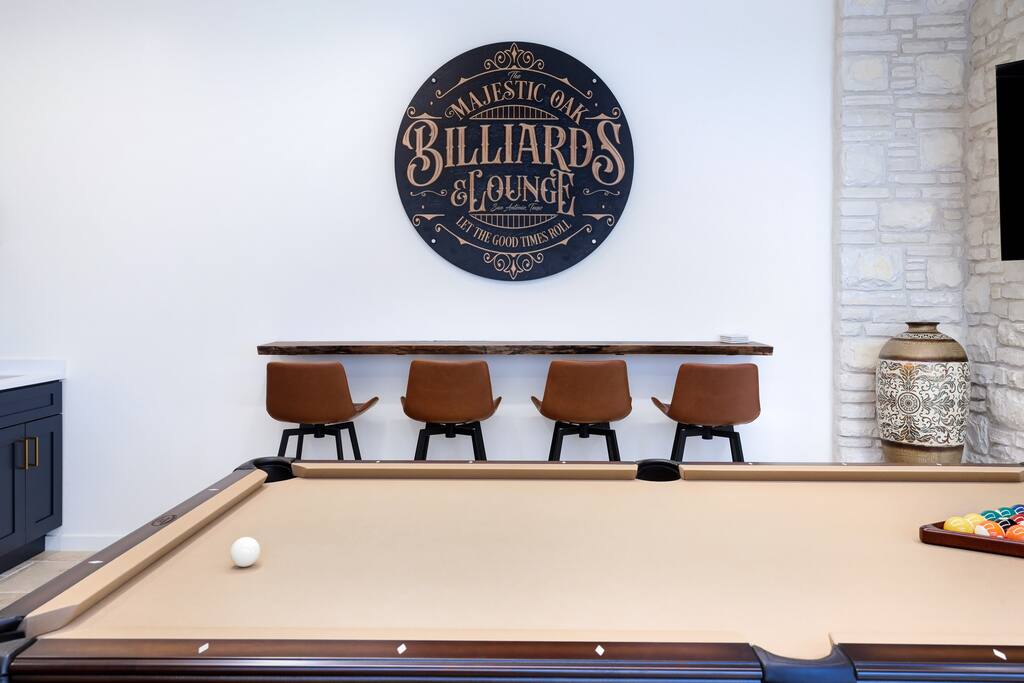 Welcome to Majestic Oak, a stunning 6,500 sq ft estate on 4 private acres, perfect for your next group getaway. This beautiful home sleeps up to 16 guests with a master suite, king bedrooms, and custom bunk room. Relax by the resort-style pool, soak in the hot tub, or play billiards in our game room. The chef's kitchen makes hosting memorable meals effortless. Located just 15 minutes from Six Flags, La Cantera, and The Rim - peaceful privacy with easy access to San Antonio's top attractions.