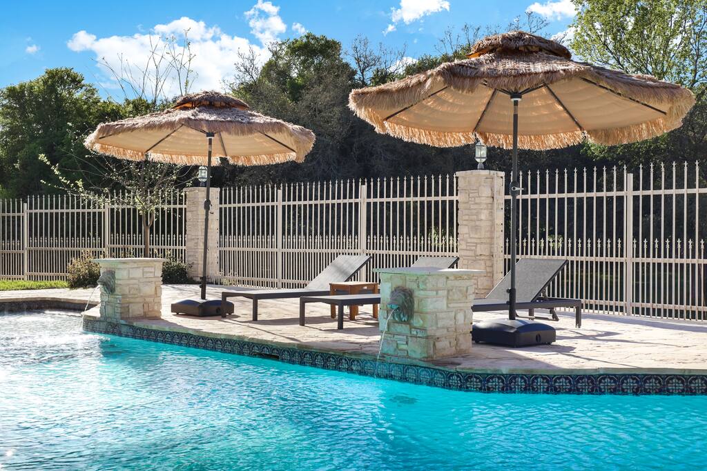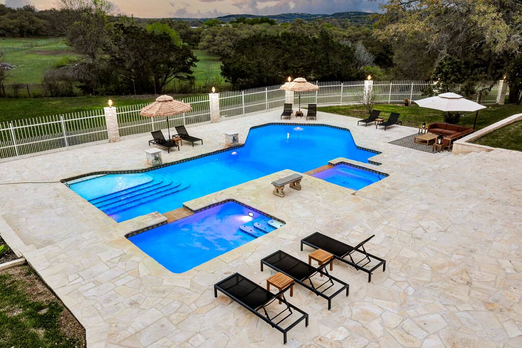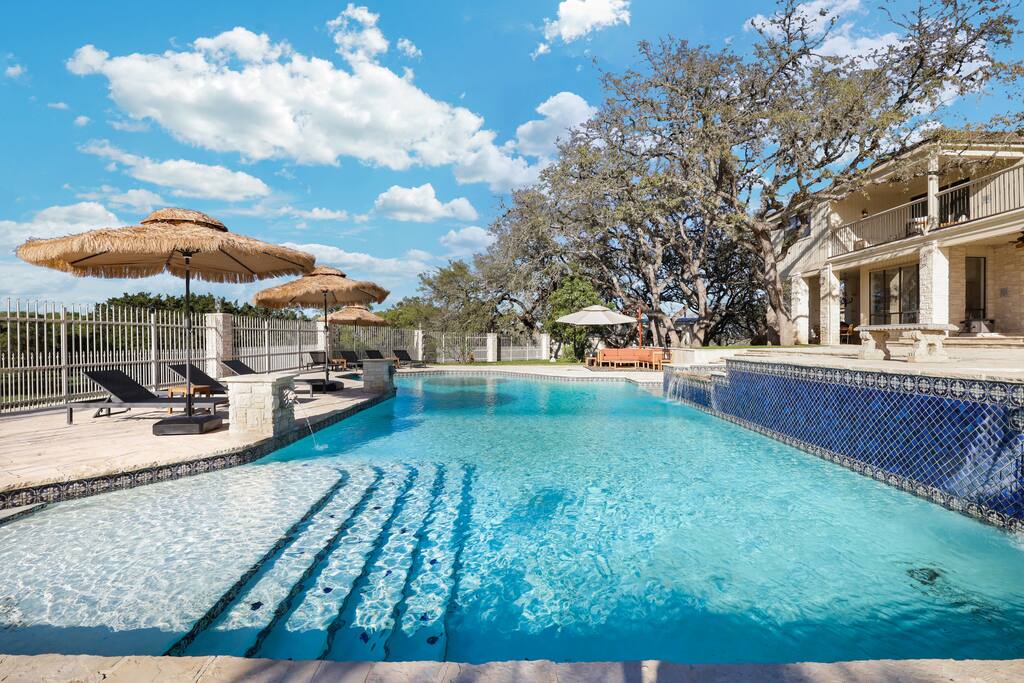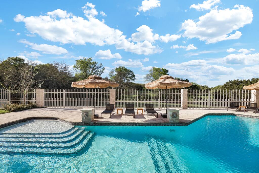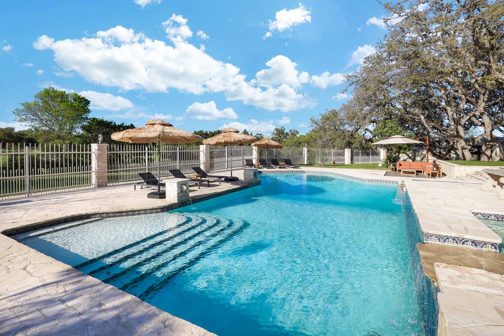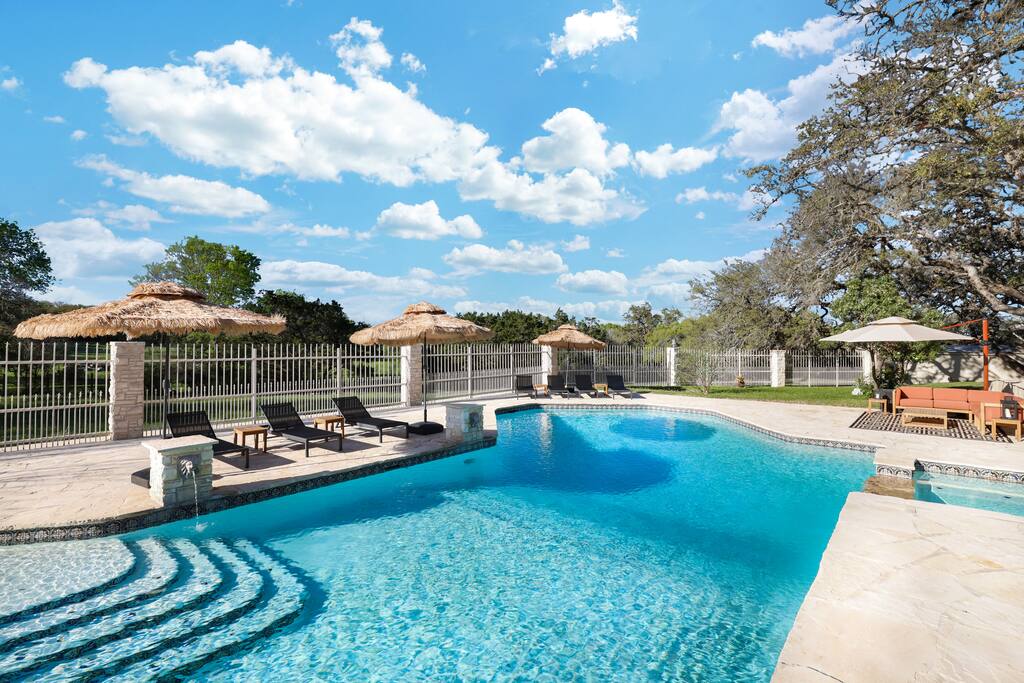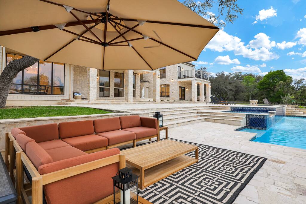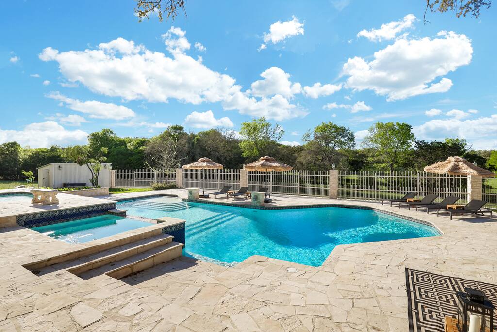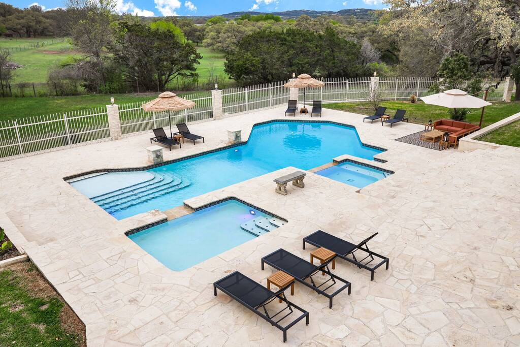 Welcome to Majestic Oak, a stunning 6,500 sq ft estate on 4 private acres, perfect for your next group getaway. This beautiful home sleeps up to 16 guests with a master suite, king bedrooms, and custom bunk room. Relax by the resort-style pool, soak in the hot tub, or play billiards in our game room. The chef's kitchen makes hosting memorable meals effortless. Located just 15 minutes from Six Flags, La Cantera, and The Rim - peaceful privacy with easy access to San Antonio's top attractions.